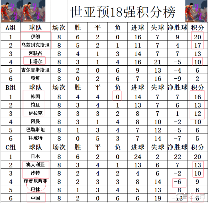积分榜方面,伊朗和日本都是6胜2平保持不败,伊朗成为第2支锁定正赛资格的亚洲球队。韩国同样是保持不败,只是他们的平局太多,昨晚战平约旦后已经是3连平,他们现在仍然是领先约旦3分位列榜首,韩国约旦战平,本是伊拉克一举冲进前2,并缩小和韩国差距的大好机会,不料他们却爆冷输给了巴勒斯坦,硬是把好机会拱手让出,B组依然是目前最有悬念的小组,最后两轮前2的,榜首的悬念都还在。A组卡塔尔同样是爆冷输球,他们已经是提前无缘前2。和卡塔尔一样提前无缘前2的还有我们中国国足,输给澳大利亚后,我们净胜球劣势还是垫底,现在不仅提前无缘前2,争4也已经很被动,下轮若不能击败印尼,恐怕就是提前无缘前4,彻底被淘汰了。